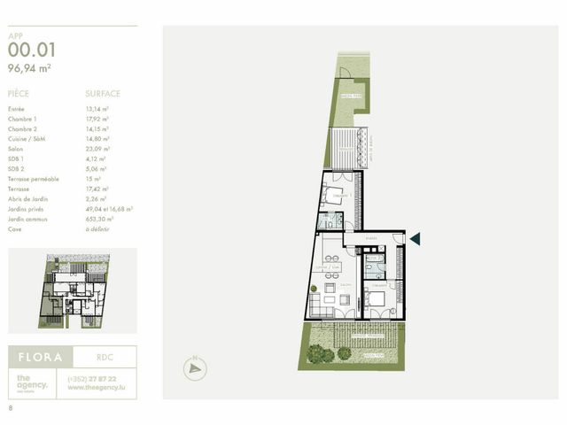 Appartement 00.01 d'une superficie de 96,94m2 habitable au rez-de-chaussée disposant d'un hall d'entrée (13,14m2), d‘une cuisine-salle à manger (14,80m2) ouverte sur un living (23,09m2) avec accès à une terrasse (15,00m2) et un jardin privatif (49,04m2), une salle de bain-WC (5,06m2), deux chambres : une chambre (14,15m2) donnant accès à la terrasse et au jardin privatif, une seconde chambre (17,92m2) avec une salle de douche-WC (4,12m2) donnant accès à une seconde terrasse (17,42m2) et un second jardin privatif (16,68m2).