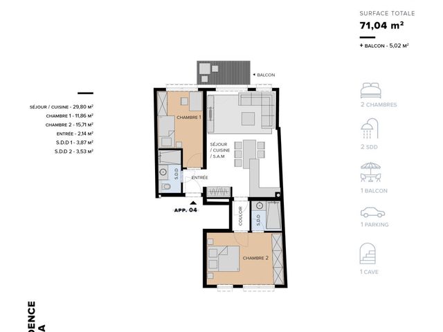 Appartement 4 d'une superficie de 71,04m2 habitable au deuxième étage disposant d'un hall d'entrée (2,14m2),d‘une cuisine ouverte sur une salle à manger-séjour (29,80m2), , avec accès à un balcon (5,02m2). Cet appartement comporte également une salle de douche-WC (3,87m2) et deux chambres (11,86m2 à 15,71m2) dont une avec salle de douche(3,53m2).