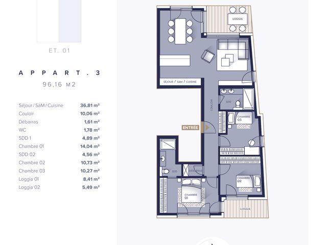 Appartement 01.03 d'une superficie de 96,16m2 habitable au premier étage disposant d'un couloir (10,06m2) qui dessert un séjour/cuisine/salle-à-manger (36,81m2) avec accès à une première loggia (8,41m2), une salle de douche-WC (4,89m2), un débarras (1,61m2), trois chambres (10,27m2, 10,73m2 et 14,04m2). L'une des chambres (14,04m2) dispose d'une salle de douche-WC (4,66m2) et d'un accès à une seconde loggia (5,49m2). La seconde loggia est également accessible depuis la chambre de 10,73m2.