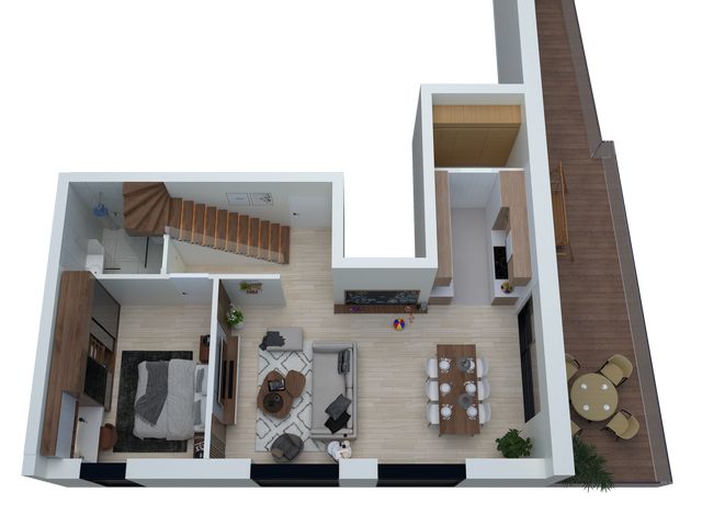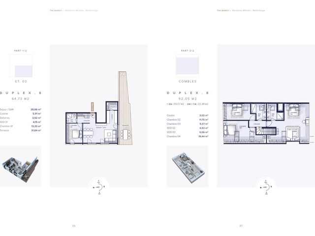 Duplex 03.08 d'une superficie de 124,30 m2 habitables au troisième et quatrième étage. Au troisième étage vous disposez d'une surface habitable de 64,73m2 composée d'une salle de douche-WC (4,15m2), une chambre (13,33m2), un séjour/salle-à-manger (28,66m2) avec accès à une cuisine (5,91m2) et un débarras (3,52m2). Une terrasse (31,64m2) est accessible depuis le séjour/salle-à-manger.