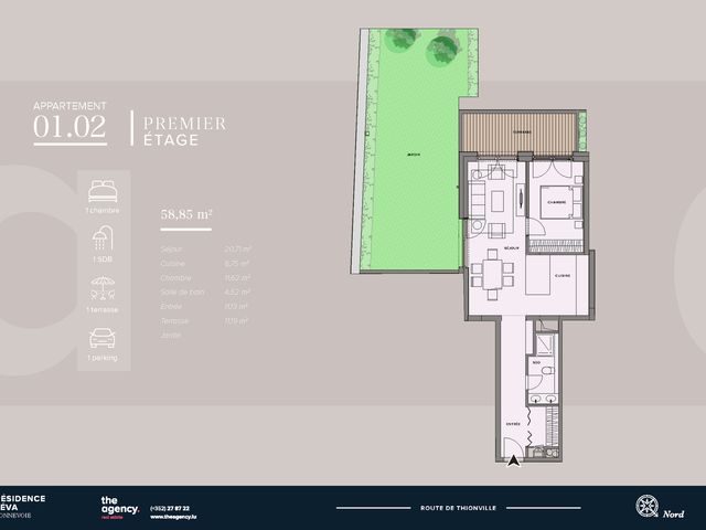 Appartement 1.02 d'une superficie de 58,85 m2 habitable au 1er étage disposant d'un hall d'entrée (11,13 m2), d‘une cuisine ouverte (8,75 m2) sur une salle à manger (8,38m2) et un living (12,33 m2). Cette pièce à vivre est particulièrement agréable car ouverte sur l'extérieur : un accès direct à grand jardin privatif d'un côté et de l'autre une terrasse privative de 12,24 m2. L'appartement dispose d'une chambre (11,62 m2) avec accès à la terrasse et une salle de bain-WC (4,52m2).