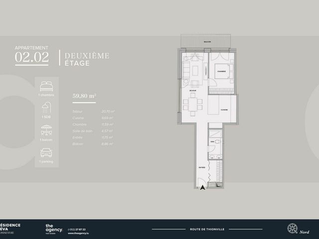 Appartement 2.02 d'une superficie de 59,80 m2 habitable au 2ème étage disposant d'un hall d'entrée (11,75 m2), d‘une cuisine (9,69 m2) ouverte sur une salle à manger (8,35 m2) et sur un living (12,35 m2) avec accès à un balcon (8,86 m2), une chambre (11,59 m2) avec accès au balcon et une salle de bain-WC (4,57 m2).