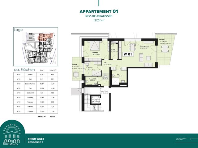 Appartement W01 d'une superficie de 127,51m2 au rez-de-chaussée disposant d'un couloir (16,09m2) qui dessert un WC (4,50m2), une salle de douche-WC (8,81m2), deux chambres de 11,68m2 et 22,44m2 dont une chambre avec accès à une première terrasse (5,32m2), une pièce de rangement (4,99m2), une cuisine-salle à manger ouverte sur un living (42,87m2) avec accès à une seconde terrasse (10,81m2).