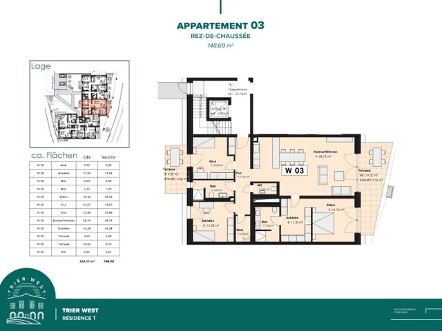 Appartement W03 d'une superficie de 148,69m2 au rez-de-chaussée disposant d'un couloir (11,07m2) qui dessert un WC (2,21m2), une salle de douche-WC (6,20m2), une pièce de rangement (3,22m2), une cuisine-salle à manger ouverte sur un living (48,75m2) avec accès à une première terrasse (9,76m2), trois chambres de 13,85m2 à 16,12m2 : une chambre (13,85m2) avec accès à une seconde terrasse (4,66m2), une deuxième chambre (14,28m2) et une troisième chambre (16,12m2) avec accès à la première terrasse qui dispose d'un dressing (11,35m2) et d'une salle de douche-WC (7,22m2).