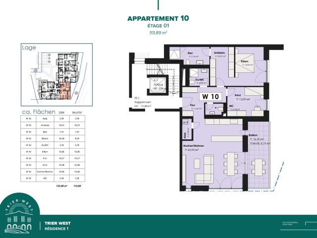 Appartement W10 d'une superficie de 113,89m2 au premier étage disposant d'un couloir (11,27m2) qui dessert un WC (2,18m2), une salle de douche-WC (3,78m2), une pièce de rangement (2,18m2), une cuisine-salle à manger ouverte sur un living (43,90m2) avec accès à un balcon (8,19m2), deux chambres de 12,09m2 et 12,95m2 dont une chambre avec un dressing (10,21m2) et une salle de douche-WC (7,14m2).