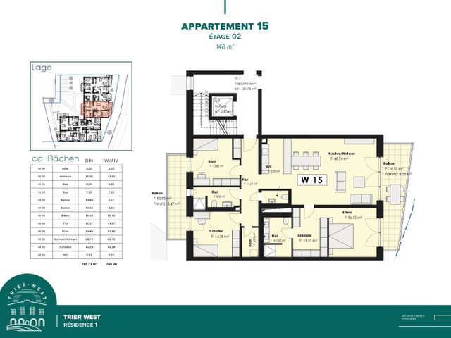 Appartement W15 d'une superficie de 148m2 au deuxième étage disposant d'un couloir (11,07m2) qui dessert un WC (2,21m2), une salle de douche-WC (6,20m2), une pièce de rangement (3,22m2), une cuisine-salle à manger ouverte sur un living (48,76m2) avec accès à un premier balcon (8,25m2), trois chambres de 13,85m2 à 16,12m2 : une chambre (13,85m2) avec accès à un second balcon (5,47m2), une deuxième chambre (14,28m2) avec accès au second balcon et une troisième chambre (16,12m2) avec accès au premier balcon qui dispose d'un dressing (11,35m2) et d'une salle de douche-WC (7,22m2).