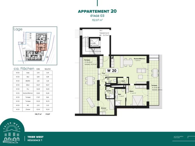 Appartement W20 d'une superficie de 112,07m2 au troisième étage disposant d'un couloir (10,25m2) qui dessert un WC (2,12m2), une pièce de rangement (2,45m2), une cuisine-salle à manger ouverte sur un living (33,94m2) avec accès à une première terrasse (8,94m2), deux chambres de 12,10m2 et 16,57m2 : une chambre de 12,10m2 avec une salle de douche-WC (3,36m2) avec accès à une seconde terrasse (15,76m2) et une deuxième chambre de 16,57m2 avec une salle de douche-WC (6,58m2) avec accès à la première terrasse. La seconde terrasse est également accessible depuis le couloir.