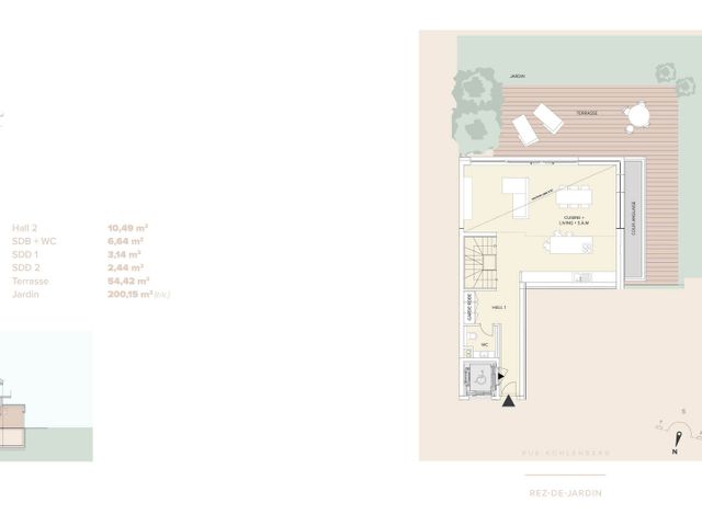 Magnifique appartement duplex de 140,03 m2 habitable au -1 et rez-de-chaussée avec un accès par les deux niveaux. Il dispose au -1 ; d'un hall d'entrée (10,59 m2), d'une cuisine-salle à manger-living (46,33 m2) avec accès à la terrasse (54,42 m2) et au jardin (200,15 m2), un WC (3,08 m2), puis au rez-de-chaussée il est composé d'un hall d'entrée (10,49 m2), de 3 chambres avec dressing / garde-robe (13,05 m2, 14,26 m2 et 15,37 m2), une salle de douche dans la chambre parentale (3,14 m2), une salle de douche dans la seconde chambre (2,44 m2) et une salle de bain-WC séparée (6,64 m2). Une cave et un emplacement intérieur sont compris dans le prix.