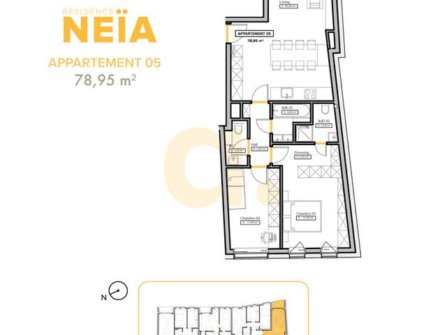 Appartement 05 d'une superficie de 78,95m2 habitables au premier étage disposant d'une cuisine-salle à manger ouverte sur un living (36,40m2) avec accès à une terrasse (4,65m2), un hall (3,60m2) desservant un WC (2,20m2), une salle de bain (3,00m2), une chambre (11,40m2) et une deuxième chambre (12,30m2) avec un dressing (5,65m2) et sa salle de douche (3,20m2).
