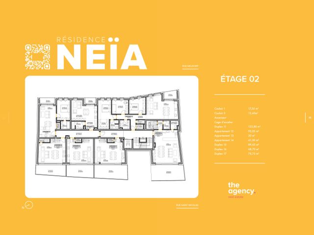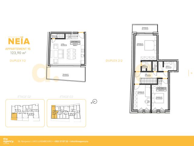 Duplex 15 d'une superficie de 89,65m2 habitables au deuxième et troisième étage disposant d'une cuisine- salle à manger ouverte sur un living (28m2) avec accès à une terrasse (14,45m2), une pièce de rangement (1,85m2).