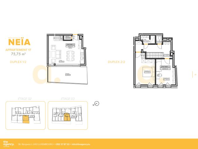Duplex 17 d'une superficie de 75,75m2 habitables au deuxième et troisième étage disposant d'une cuisine-salle à manger ouverte sur un living (31m2) avec accès à une terrasse (20,80m2).