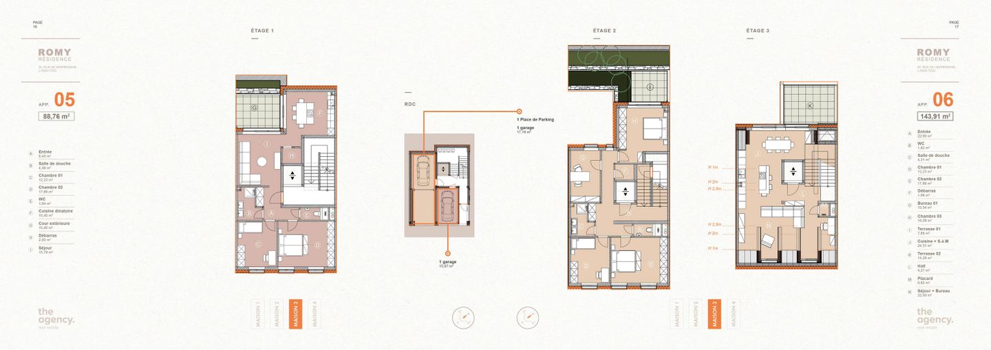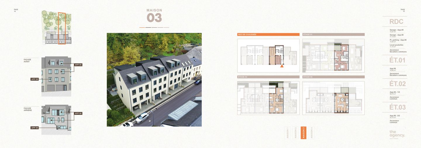 L'app 06 se compose au premier niveau de trois chambres (12,23 m2, 17,66 m2 et 16,08 m2), d'un bureau (10,54 m2), d'une salle de douche (4,31m2), d'un WC indépendant (1,82 m2),et d'un débarras (1,98 m2). La plus grande chambre profite d'une terrasse privative (7,66 m2) bordée de verdure.
