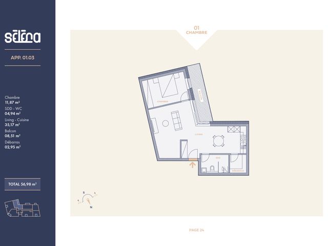 ÉTAGE 01 - Appartement 01.03 de 56,98 m2 habitables au premier étage disposant d'un hall d'entrée de 2,94 m2, d'une chambre de 14,23 m2, d'un débarras de 2,92 m2, d'une salle de douche (+ WC) de 4,70 m2. L'appartement dispose également d'une pièce à vivre (cuisine-séjour) de 30,81 m2 dont la grande baie vitrée donne accès au balcon de 8,51 m2.