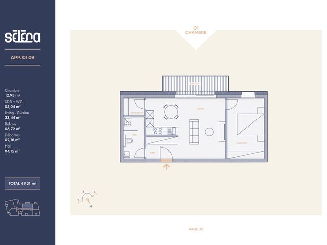 ÉTAGE 01 - Appartement 01.09 de 49,31 m2 habitables au premier étage disposant d'un hall d'entrée de 4,15 m2, d‘une pièce à vivre lumineuse (cuisine-séjour) de 23,44 m2 donnant accès à un agréable balcon de 6,72 m2 exposé sud-ouest. L'appartement dispose d'un débarras de 2,16 m2, d'une salle de douche - WC de 5,04 m2 et d'une chambre de 12,93 m2.