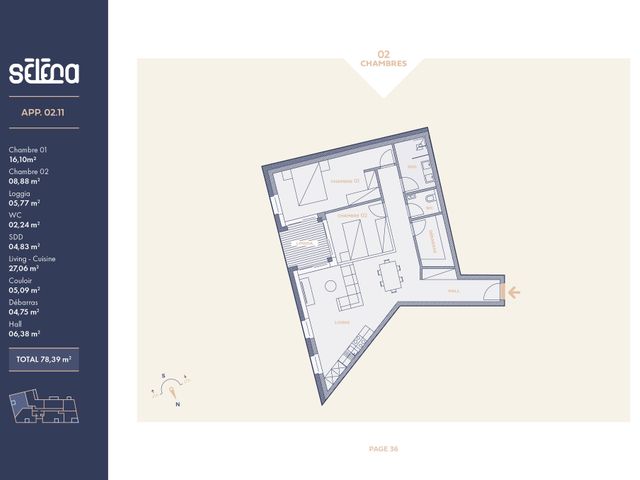 ÉTAGE 02 - Appartement 02.11 de 78,39 m2 habitables au deuxième étage disposant d'un hall d'entrée de 6,38 m2, d‘une pièce à vivre (cuisine-séjour) de 27,06 m2 avec accès direct à une loggia de 5,77 m2. L'appartement dispose également de deux chambres de 8,88 et 16,10 m2, d'une salle de douche de 4,83 m2, de WC séparé de 2,24 m2 et enfin d'un débarras de 4,75 m2.