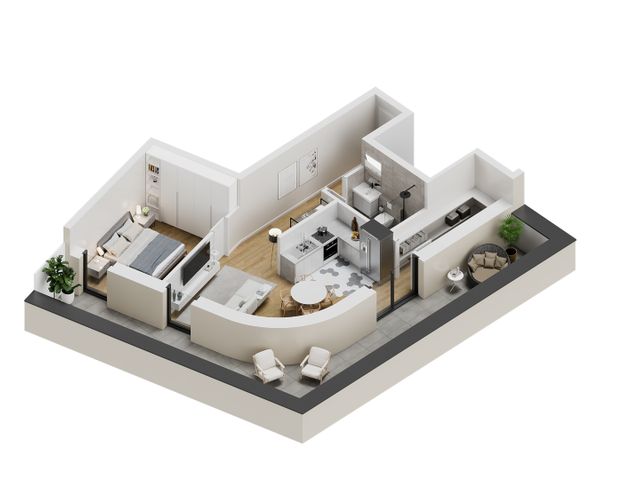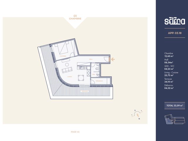 ÉTAGE 03 EN RETRAIT - Appartement 03.18 de 55,09 m2 habitables au troisième étage disposant d'un hall d'entrée de 08,54 m2 qui dessert une salle de douche - WC de 4,23 m2, une chambre de 12,60 m2 et une pièce à vivre (cuisine-séjour) de 23,73 m2. Le cachet de ce pièce de vie est un bel angle arrondi entouré de deux accès à la terrasse de 34,10 m2. La Chambre donne également accès à la terrasse. L'appartement dispose d'un débarras de 4,32 m2.