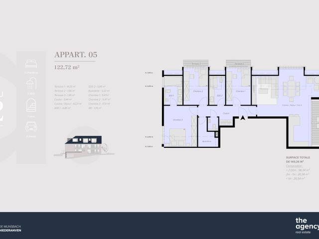 Appartement 5 d'une superficie de 122,60m2 habitable au niveau des combles disposant d'un couloir (9,44m2), d'une cuisine- salle à manger- séjour (42,41m2)avec accès à une terrasse (14,25m2), 3 chambres (de 11,47m2 à 17,31m2) dont deux chambres avec accès à deux terrasses privatives (1,95m2 chacune), un débarras/buanderie (5,32m2), un WC séparé (1,76m2), deux salles de douche-WC (5,89m2 et 6,85m2). Cet appartement dispose de deux emplacements intérieurs de parking.