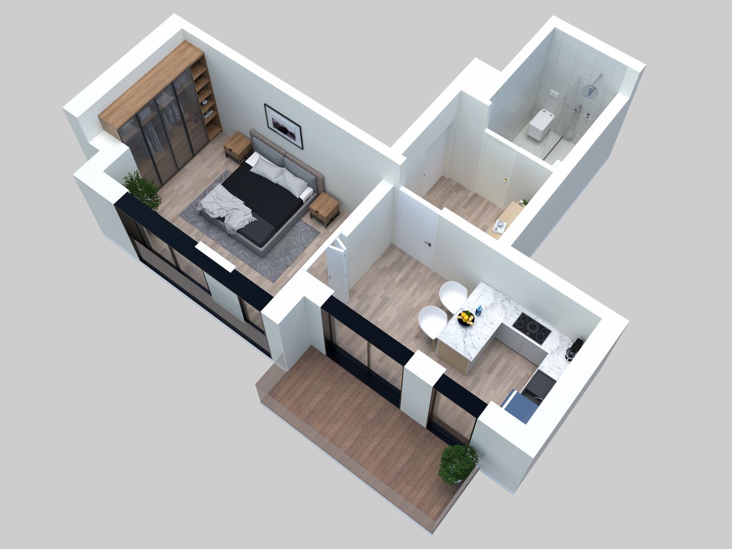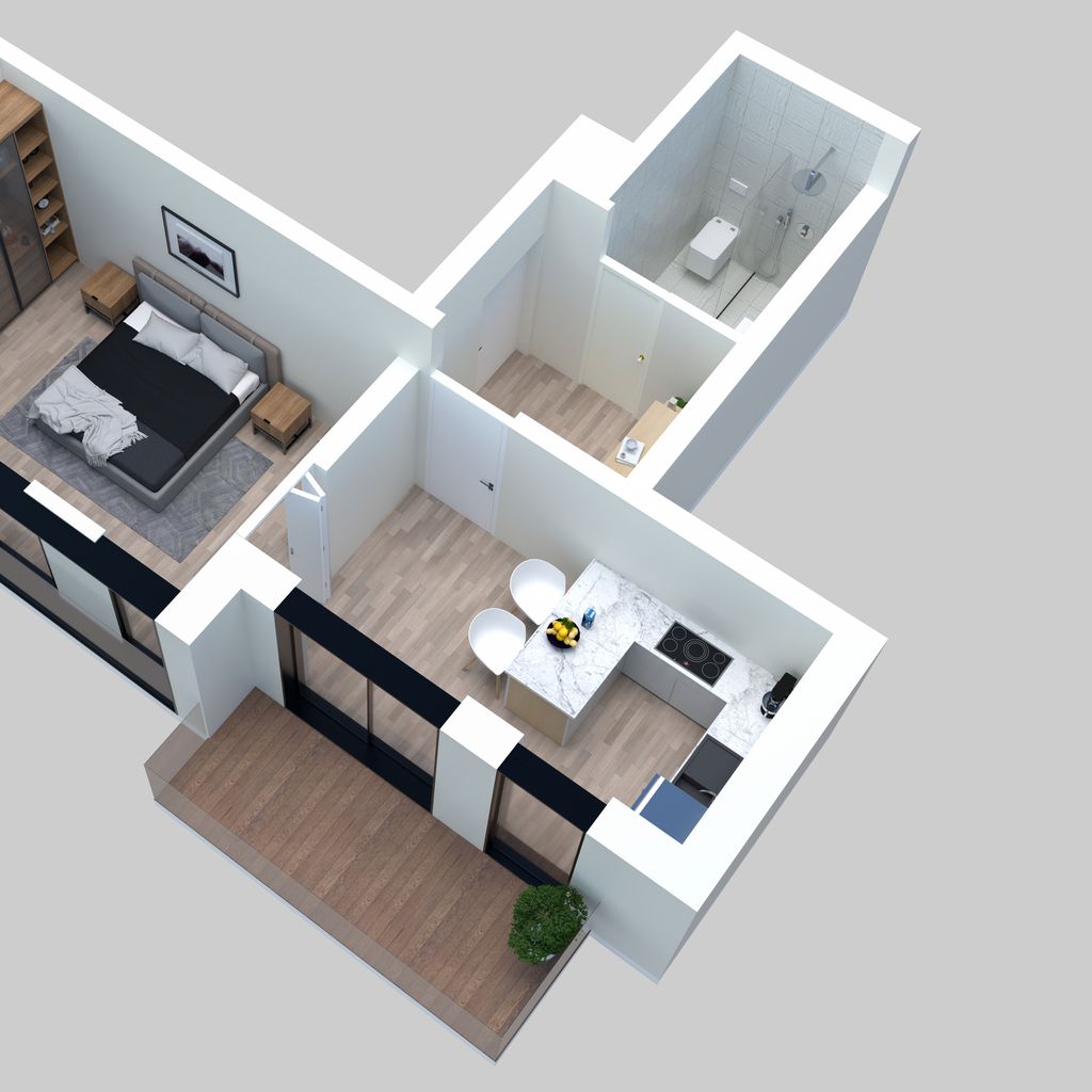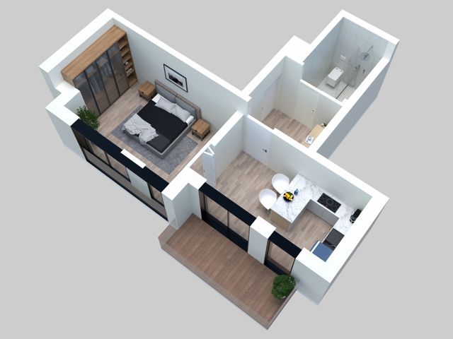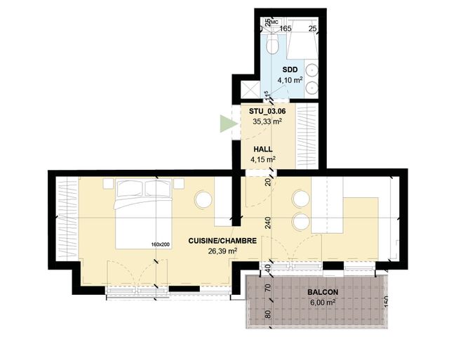 L'appartement se compose d'une grande chambre séparé, d'une salle de douche de 4,10m2 et d'un espace séjour/cuisine avec un hall d'entré permettant l'installation d'un placard/dressing.