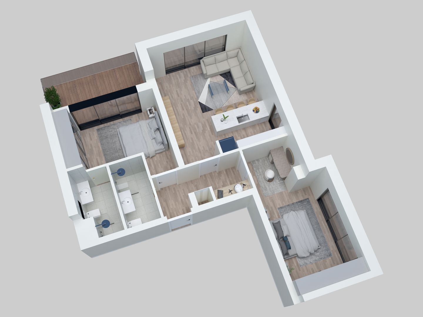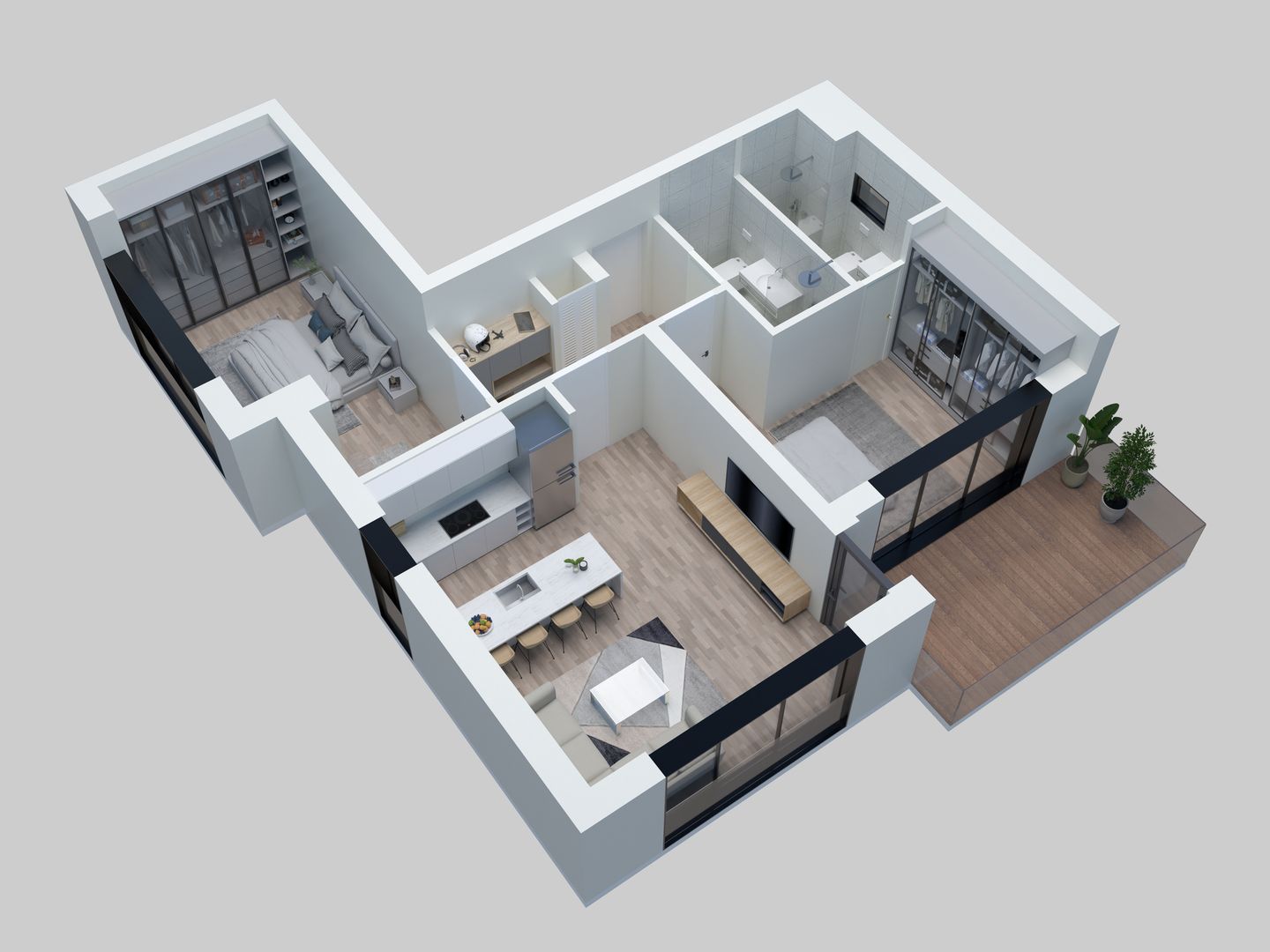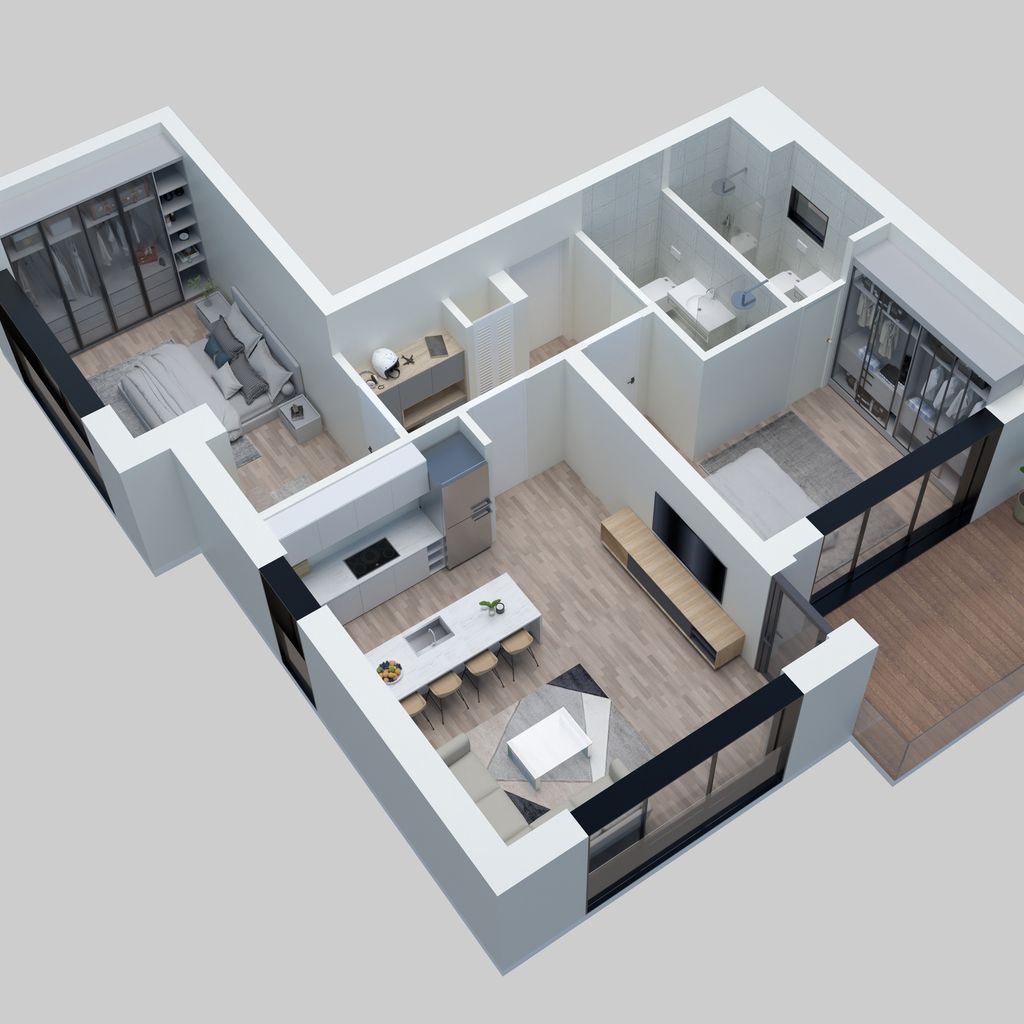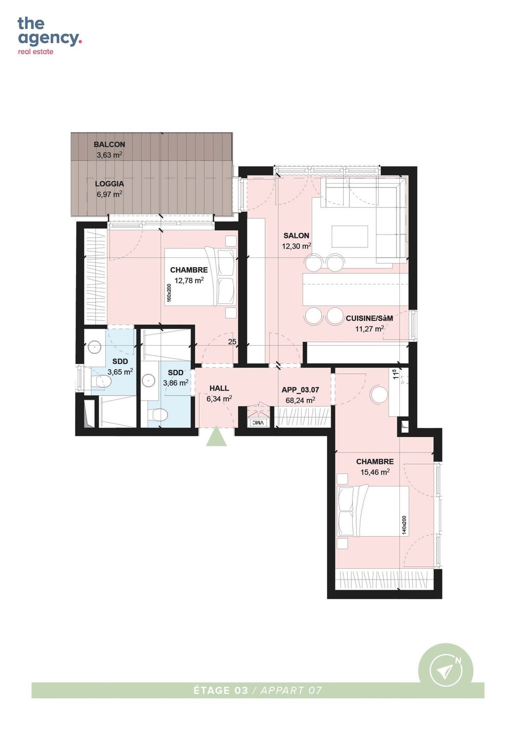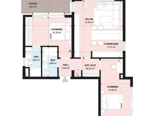 L'appartement se compose de deux chambres de 12,78 m2 et 15,46 m2, de deux salles de douche de 3,86 et 3,65 m2, d'une cuisine de 11,27 m2 ouverte sur le salon de 12,30 m2. La chambre et le salon jouissent d'un accès direct au balcon (10,60 m2)