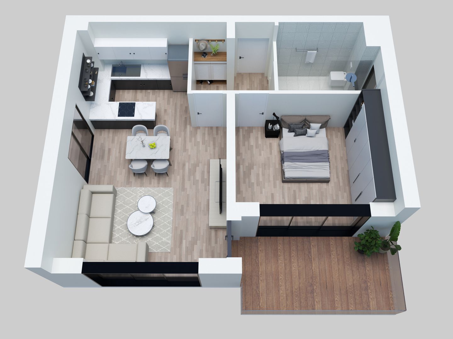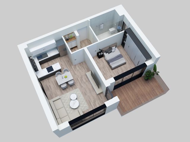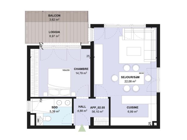 L'appartement se compose d'une grande chambre de 14,79 m2, d'une salle de douche de 5,39 m2 et d'une cuisine de 6,99 m2 ouverte sur le salon / S.à.M de 22,08 m2. La chambre et le salon jouissent d'un accès direct à la loggia-balcon (10,59 m2)