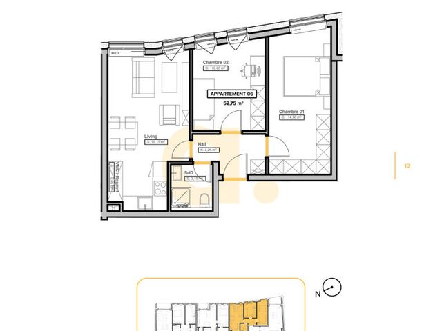 Appartement 06 d'une superficie de 52,75m2 habitables au premier étage disposant d'un hall (4,25m2), d'une cuisine-salle à manger ouverte sur un living (19,15m2), une salle de douche (3,15m2), deux chambres (10,65m2 et 14,60m2).