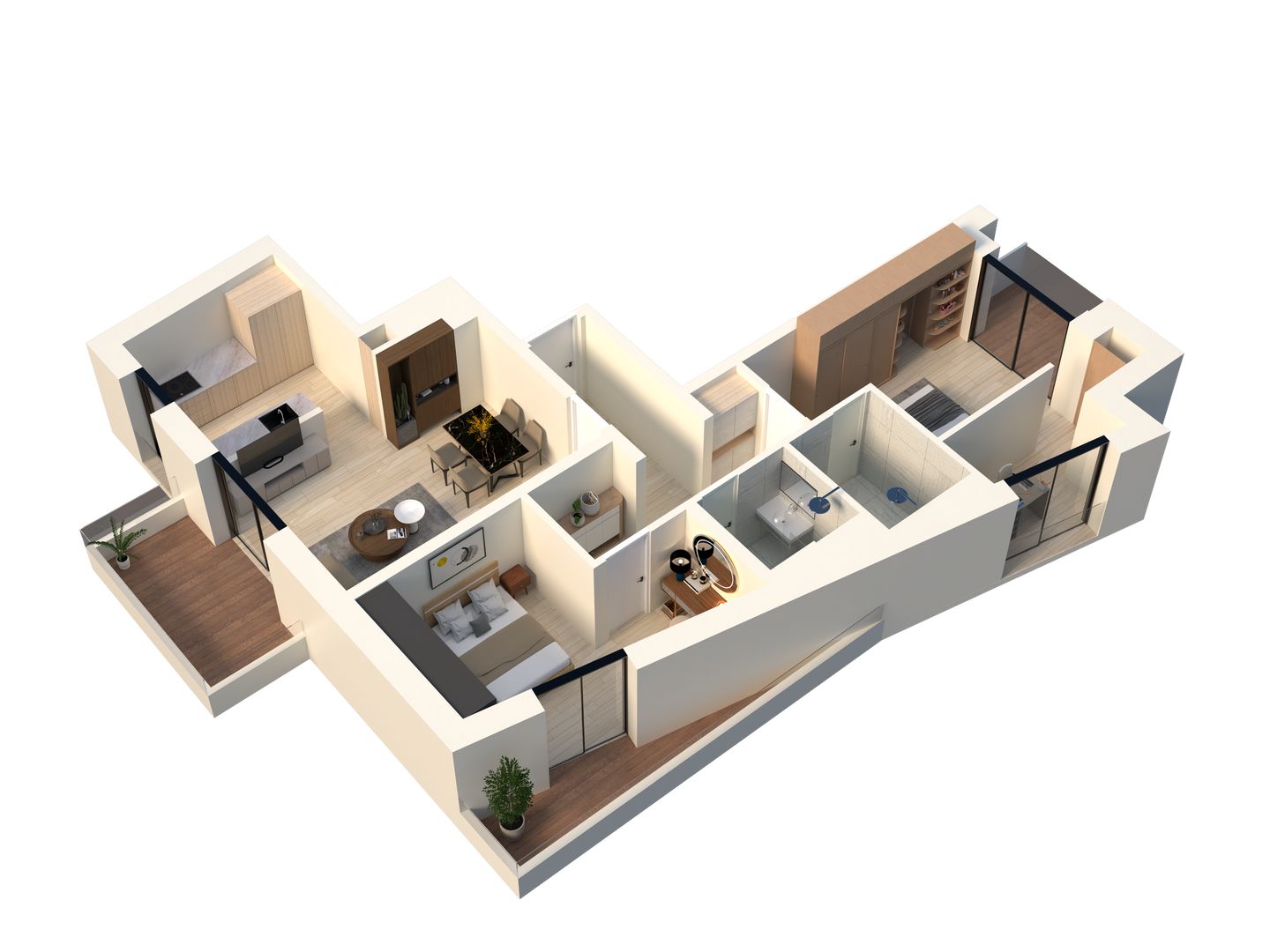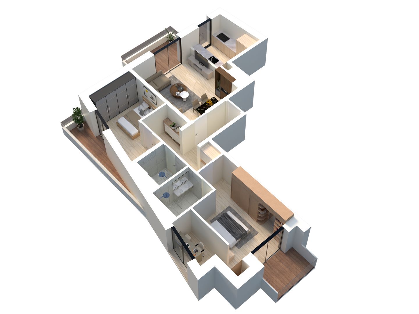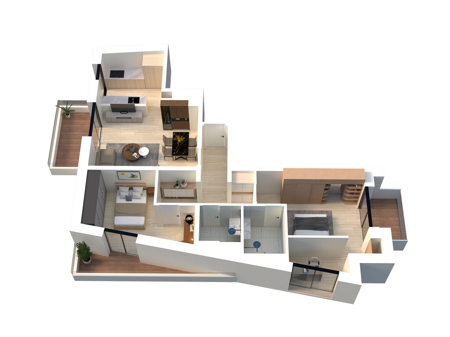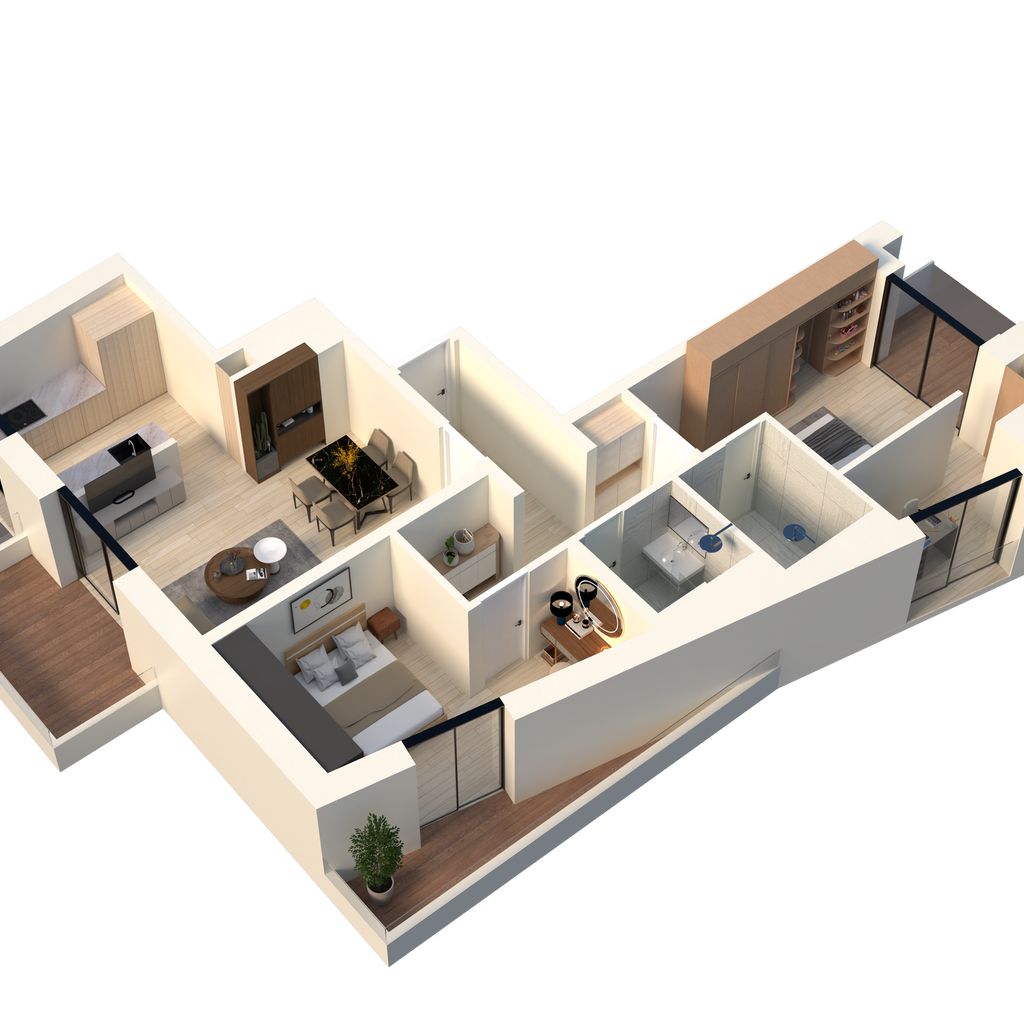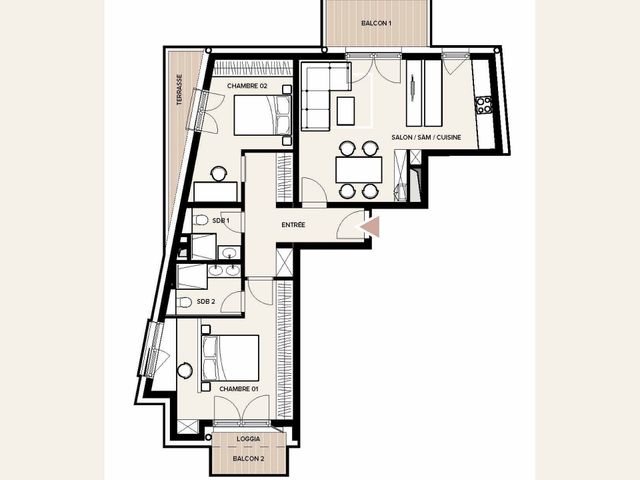 Cet appartement propose une pièce de vie de 28,42 m2 avec balcon, une chambre parentale avec balcon et sa propre salle de douche-WC de 4,54 m2, une seconde chambre de 12,68 m2 avec une petite terrasse et une seconde salle de douche-WC de 3,46 m2.