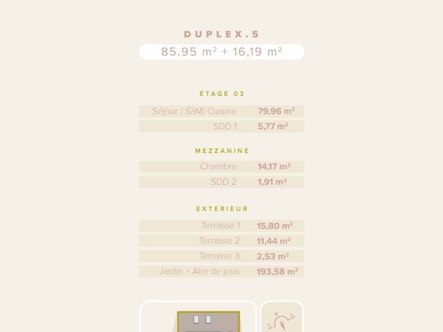 Cet appartement en duplex se compose d'un premier niveau de 85,95 m2 et second de 16,19 m2.