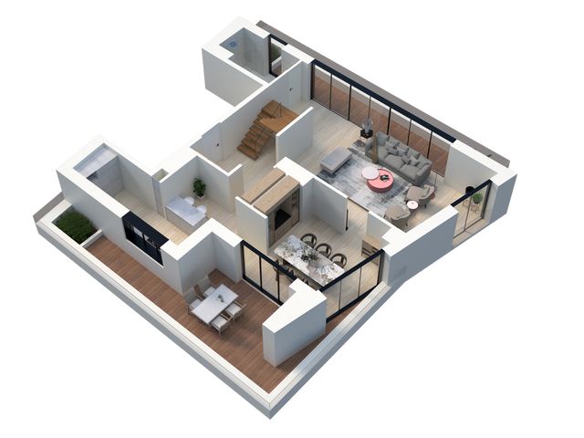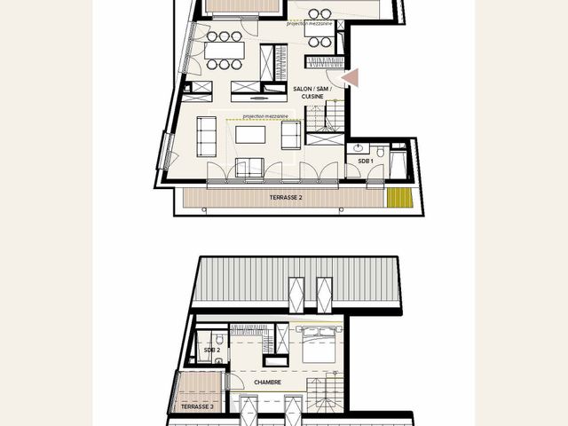 Le premier niveau propose une très grande pièce de vie ouverte, segmentée en 3 parties (salon, S-à-M et cuisine) de 79,96 m2. Deux terrasses filantes, à l'avant et à l'arrière de la résidence viennent illuminer cette belle pièce. Ce niveau est complété par une salle de douche-wc de 5,77 m2.